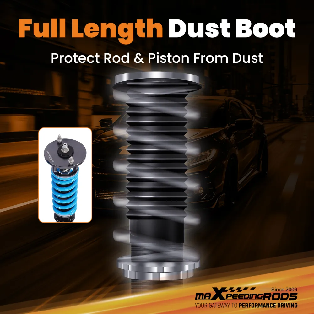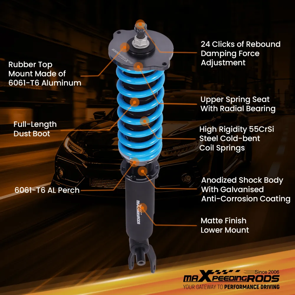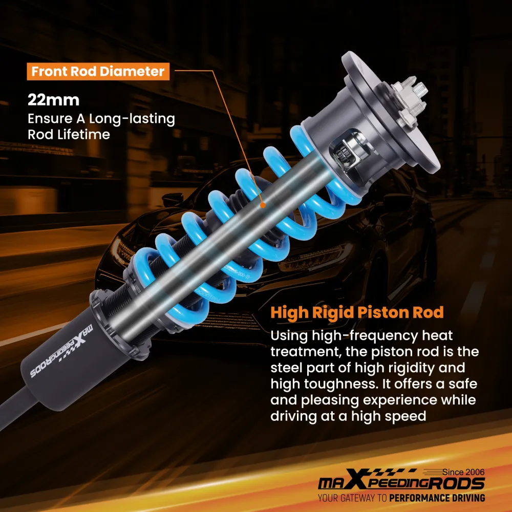 Занижающие койловеры maXpeedingrods T6, стандартно с регулируемым демпфированием отбоя, раздельной регулировкой высоты без изменения предварительной нагрузки, усовершенствованным демпфирующим маслом и модернизированными гоночными пружинами, регулируемой пластиной развала (для некоторых автомобилей) и привлекательным внешним видом, предоставляют вам больше возможностей для настройки подвески в соответствии с требованиями к производительности и придают вашему автомобилю более впечатляющий вид. Кроме того, все наши койловеры собираются на беспыльном заводе, что гарантирует высокое качество и длительный срок службы.