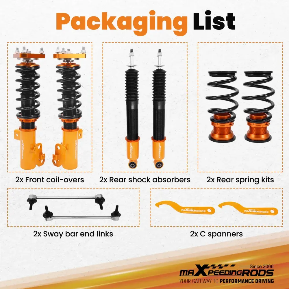 В комплект входят: комплект регулируемых амортизаторов (2 передние + 2 задние), 2 гаечных ключа, 1 пара стабилизаторов поперечной устойчивости (как показано на картинке).