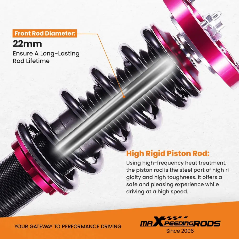 - Двухтрубная конструкция амортизатора обеспечивает низкое внутреннее трение, что повышает эффективность и снижает температуру амортизаторов.