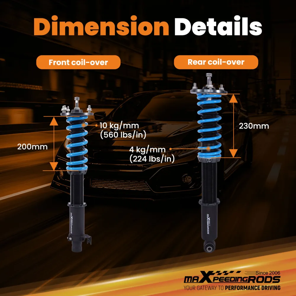 Занижающие койловеры maXpeedingrods T6, стандартно с регулируемым демпфированием отбоя, раздельной регулировкой высоты без изменения предварительной нагрузки, усовершенствованным демпфирующим маслом и модернизированными гоночными пружинами, регулируемой пластиной развала (для некоторых автомобилей) и привлекательным внешним видом, предоставляют вам больше возможностей для настройки подвески в соответствии с требованиями к производительности и придают вашему автомобилю более впечатляющий вид. Кроме того, все наши койловеры собираются на беспыльном заводе, что гарантирует высокое качество и длительный срок службы.