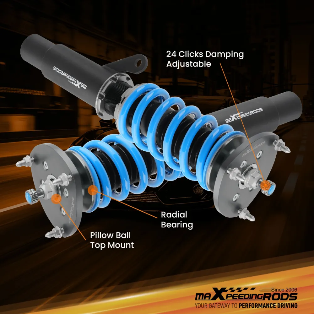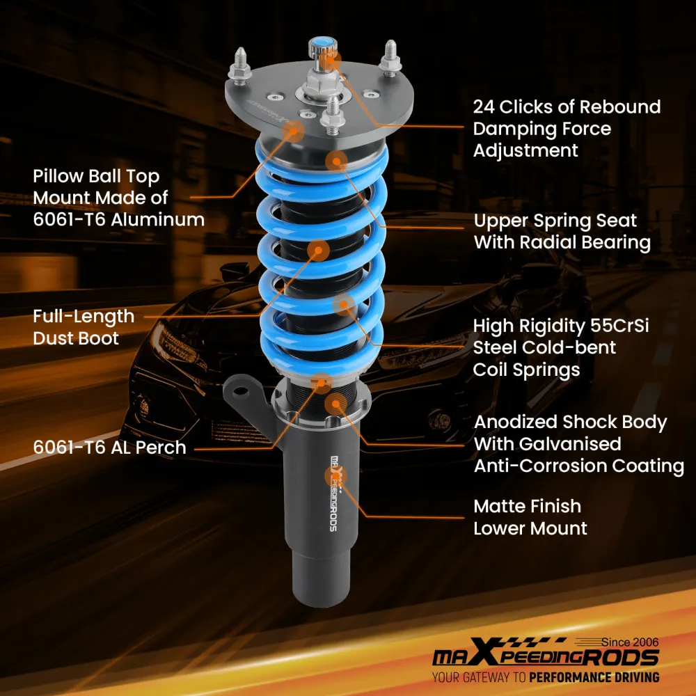 Занижающие койловеры maXpeedingrods T6, стандартно с регулируемым демпфированием отбоя, раздельной регулировкой высоты без изменения предварительной нагрузки, усовершенствованным демпфирующим маслом и модернизированными гоночными пружинами, регулируемой пластиной развала (для некоторых автомобилей) и привлекательным внешним видом, предоставляют вам больше возможностей для настройки подвески в соответствии с требованиями к производительности и придают вашему автомобилю более впечатляющий вид. Кроме того, все наши койловеры собираются на беспыльном заводе, что гарантирует высокое качество и длительный срок службы.